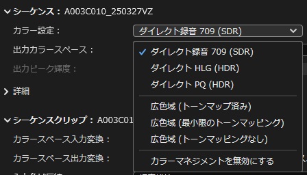 カラー設定:ダイレクト録音709(SDR) を選択します。